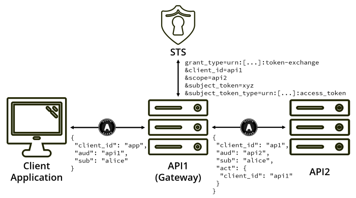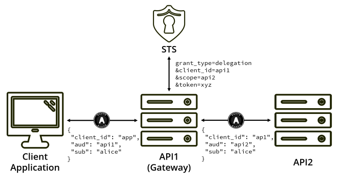 With this style, we are walking the line between delegation and impersonation. While we can get a token that includes the user and API1, API2 has no way of knowing if the difference between a token issued via user interaction and a token issued as a result of delegation.